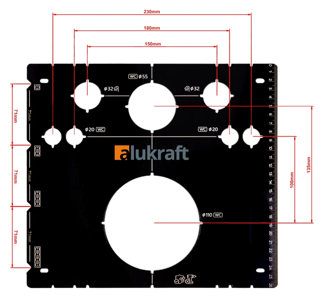 Bohrschablone für Geberit WC-Montage; Abstand 18/23 cm; Aluminium